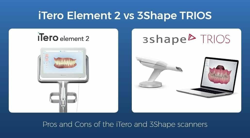 Both are very fast scanners. Both come in Black and white or colour. Both systems have subscriptions. Something to note is the iTero Element 2 is one of the biggest and heaviest scanners on the market. The TRIOS is lighter and has multiple configurations such as attaching to a laptop, cart and the TRIOS Move which is a neat concept.