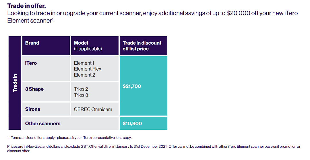iTero commonly runs promotions discounting the scanner price by up to $20,000 if you sign up for their "Fusion Agreement" also called a DEP contract.
