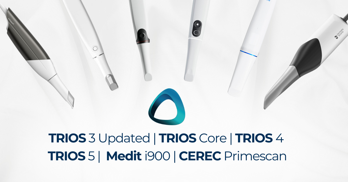 From left to right: TRIOS 3 Updated, TRIOS Core, TRIOS 4, TRIOS 5, Medit i900, and CEREC Primescan.