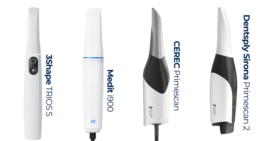 From left to right: 3Shape TRIOS 5, Medit i900, CEREC Primescan, and Dentsply Sirona Primescan 2.