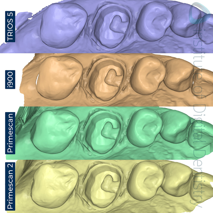 Both the TRIOS 5 and i900 produce similar color scans, which, in comparison to the Primescan and Primescan 2, appear less bright and cooler in color tone. Margins are clear in all scanners.