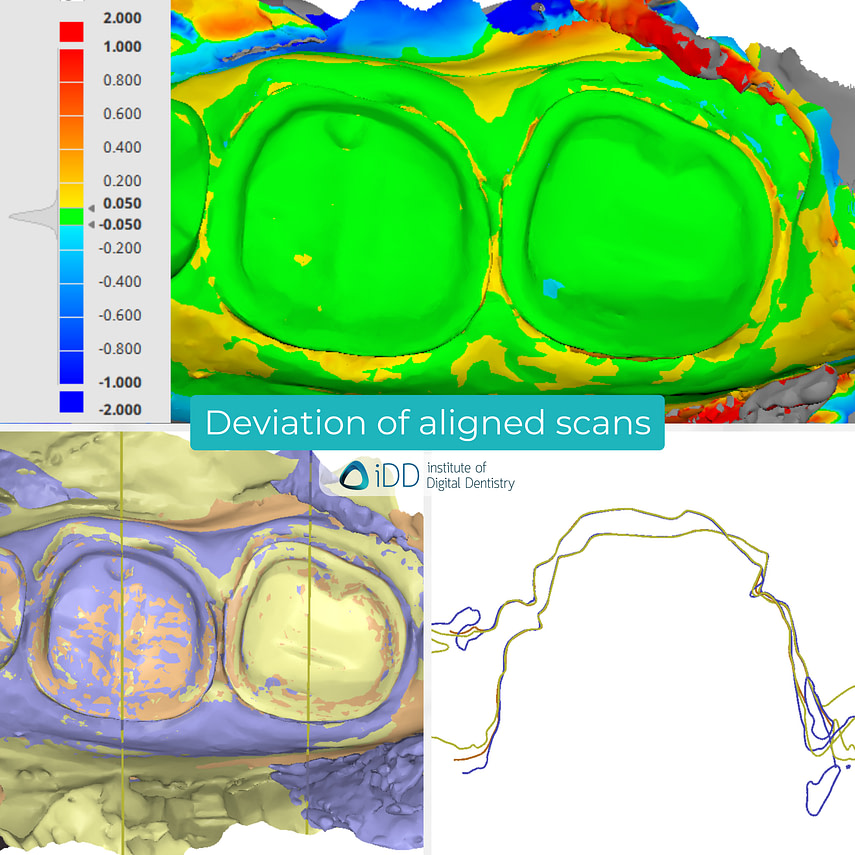 Based on the colored deviation key, we can see that the scan meshes are for the majority within 50 microns compared to the scan taken with CEREC Primescan.