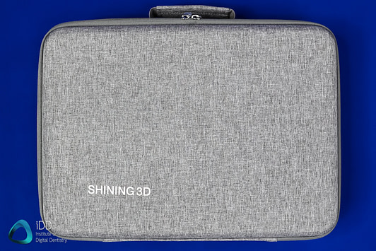 The scanner comes with a fabric travel case like a hard-shell suitcase, branded with the Shining 3D logo on the front. These travel cases have become standard with USB scanners and can be used to transport the scanner around.