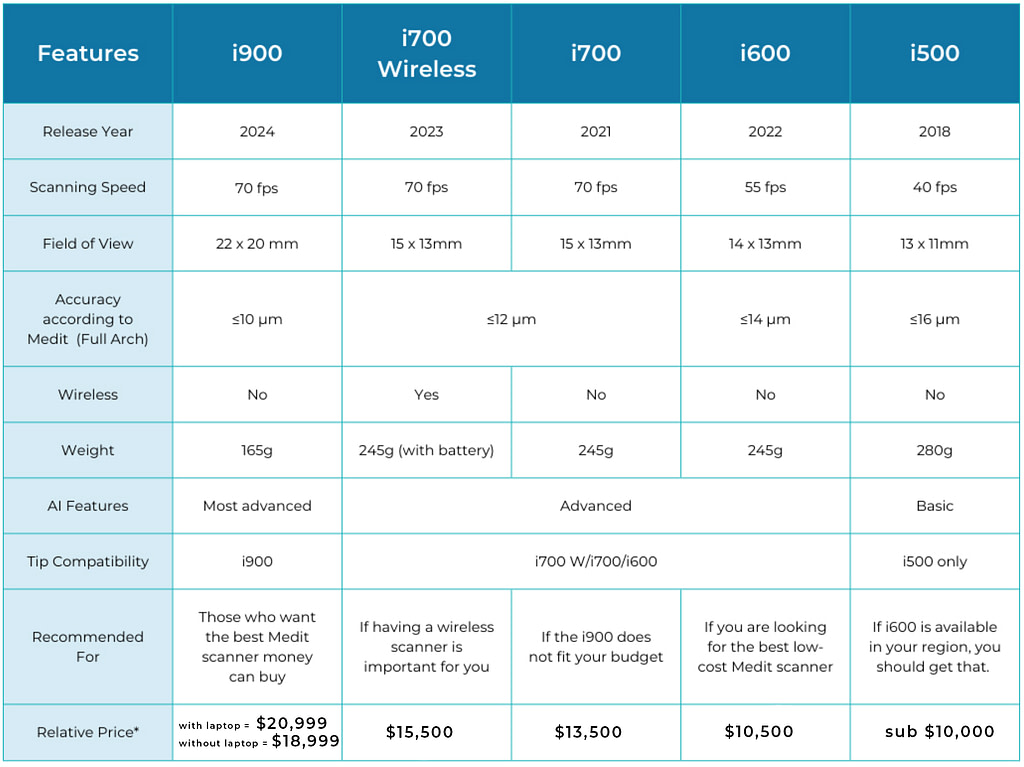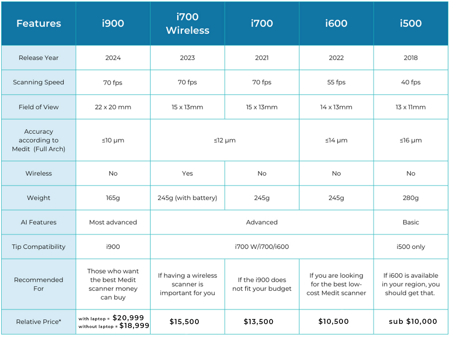 Comprehensive Comparison Table of All Medit Scanners - i900, i700 Wireless, i700, i600, and i500