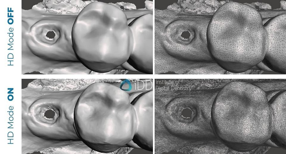 What is HD mode? It is a software toggle in the Medit software. This on-and-off switch makes the i700 scanner take a higher scan mesh density (see below).