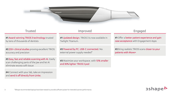 The same exact TRIOS 3 scanner scanner but with some updated quality of life improvements and a newer aesthetic.
