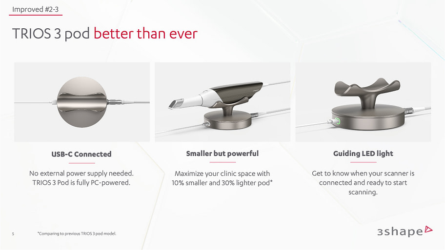 The biggest improvement is to he TRIOS 3 pod which has also been redesigned, making it 10% smaller, 30% lighter and powered by a USB-C cord; no external power supply is needed anymore.