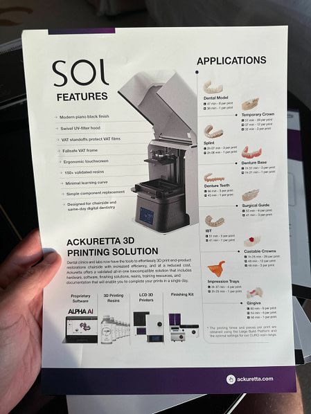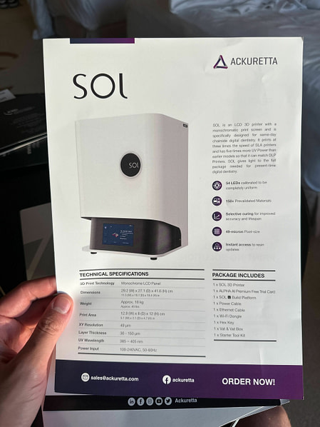 SOL is an LCD 3D Printer with a monochromatic print screen, specifically designed for same day chairsdie dentistry. It can print at up to 3 times the speed as SLA printers, and has 5 times more UV power than previous Ackuretta models.