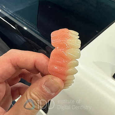 The resin is validated for both PrograPrint and Asiga systems, and while Ivoclar isn't yet offering printed teeth solutions, the material integrates seamlessly with their existing PMMA and carded teeth options. The printed samples on display demonstrated good fit and finish, particularly at the teeth-base junction when combined with traditional denture teeth.