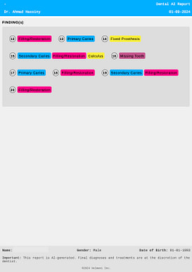 This segmentation occurs automatically when radiographs are uploaded, requiring no manual input. The system accurately identifies tooth morphology, distinguishing between different tooth types and accounting for variations in positioning and overlap. Each segmented tooth is automatically numbered according to the universal numbering system, making it easy to reference specific teeth during examination and treatment planning.